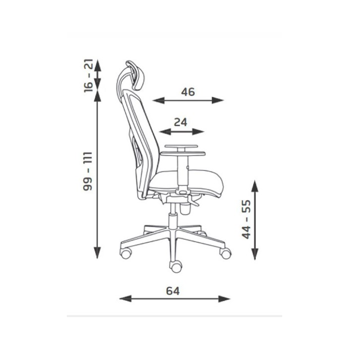 • Rozmery: šírka operadla: 48,0 cm; výška operadla: 57,0 cm; šírka sedadla: 51,0 cm; hĺbka sedadla: 46,0 cm; nastavenie výšky sedu: 44,0 - 55,0 cm