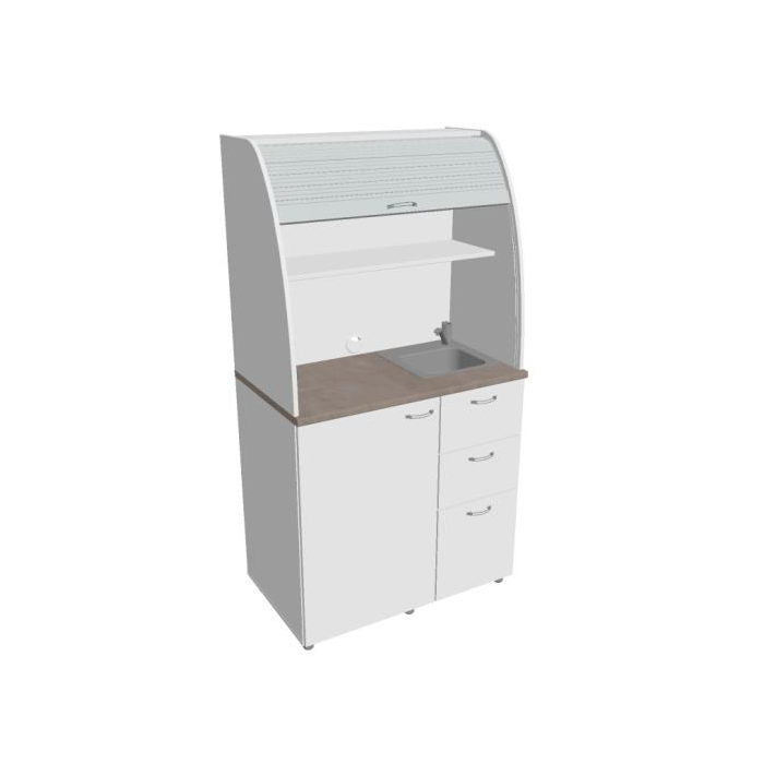 • Dve police vo vrchnej časti kuchynky poskytujú dostatočnú kapacitu na poháre, šálky a taniere. Na pracovnú dosku môžete umiestniť napr. kávovar a káblovou priechodkou v zadnej časti vyvediete kábel z priestoru kuchynky.