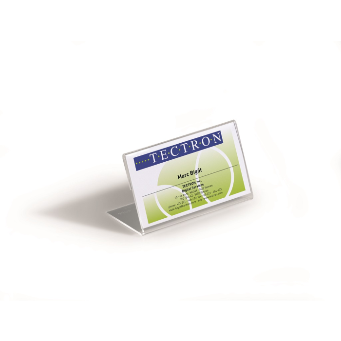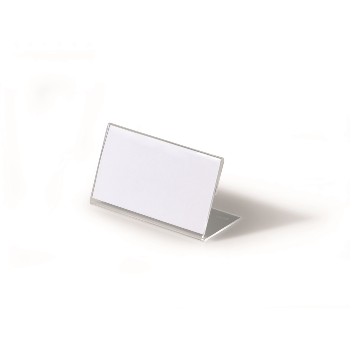 Stabilná stolová menovka „L“ profilu vyrobená z akrylu. Vhodná na konferencie, recepčné pulty, ceny tovarov a popis produktov. Väčšie balenie 10 ks. Rozmery: 52x100 mm