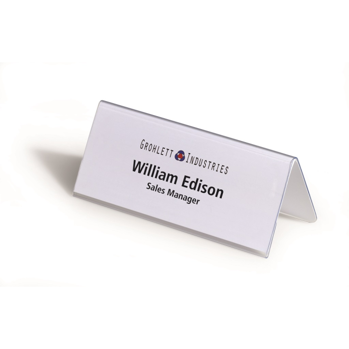 Obojstranne čitateľná stolová menovka z pevného PVC, vhodná na konferencie, recepčné pulty, ceny tovarov a popis produktov. Dodávaná s vymeniteľnou prázdnou kartou. Väčšie balenie 25 ks.