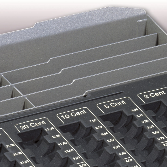 Samostatná mincová priehradka v oceľovom ráme. Rozmerovo vhodná do bežnej stolovej zásuvky. Obsahuje osem oddielov na eurá a centy v maximálnej hodnote 233,90 Euro. Priehradka na bankovky, poukážky alebo stravné lístky vo vrchnej časti. Rozmery: 328 × 59 × 286 mm