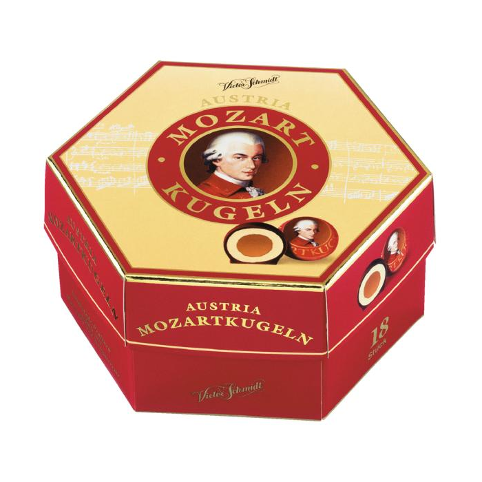 MOZARTOVE GUĽKY - BONBÓNY Z HORKEJ ČOKOLÁDY S NÁPLŇOU Z KAKAA (33%) A MANDĽOVÉHO MARCIPÁNU (40%).