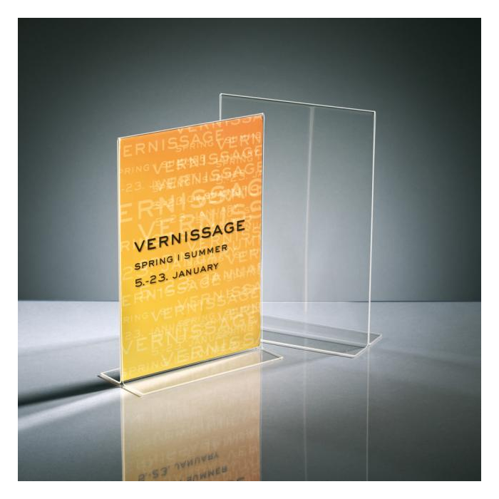 Univerzálny stojan odolný voči UV žiareniu v kolmej verzii. Vhodný na výstavy, veľtrhy, ponukové listy, jedálne lístky a propagačné materiály. Vyrobený z kvalitného číreho akrylu, stabilný a pevný. Formát A4.