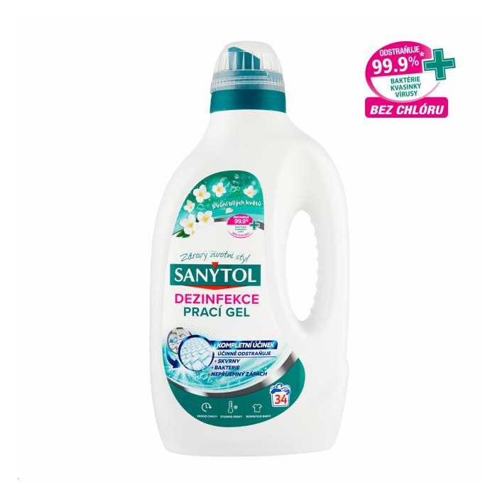 Sanytol, expert na dezinfekciu bez chlóru, vyvinul dezinfekčný prací prostriedok, ktorý účinne odstraňuje škvrny a eliminuje baktérie, mikróby a nepríjemné pachy už od teploty 20 °C. Jedinečné zloženie účinne vyperie bielu aj farebnú bielizeň a prináša intenzívny pocit sviežosti. Odstraňuje 99,9 %* baktérií, Candida albicans, vírusov.