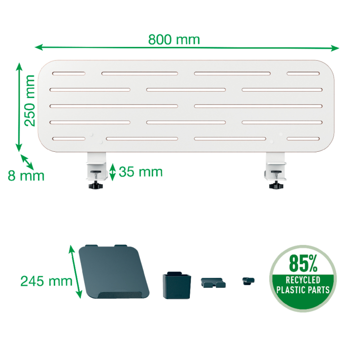 S riešením pre zavesenie tašky a predlžovacieho kábla na zadnej strane Kompatibilný s väčšinou stolov Obsah: Dierovaná doska a príslušenstvo vyrobené z 85 % z recyklovaného plastu: držiak na notebook (vhodný aj pre MacBooky), držiak na pero, držiak na smartfón a háčik